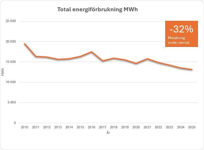 Sedan våren 2010 då vi sjösatte vår stora uppgradering av vår styr och övervakningsanläggning, har vi sparat stora mängder av energi. 2009 var sista året med den gamla anläggningen och de gamla parametrarna som bestämde hur anläggningen skulle fungera. Sedan 2009 har vi sänkt vår energiförbrukning med ett medel över 3000 MWh årligen.